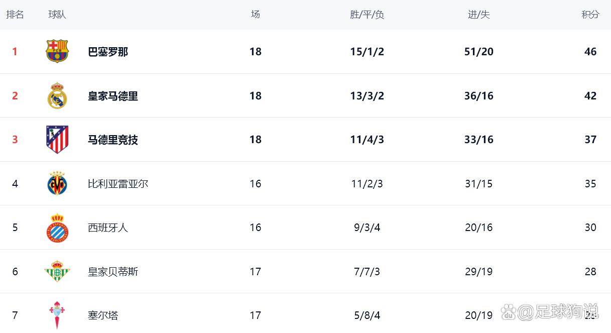 积分榜上,巴塞罗那以46分高居榜首,皇家马德里以42分紧随其后,两队仅有4分之差,冠军之争悬念迭起。马德里竞技积37分排名第三,与榜首巴萨有9分差距,争冠前景略显黯淡。比利亚雷亚尔和西班牙人分别以35分和30分位列第四和第五,皇家贝蒂斯则以28分排名第六。